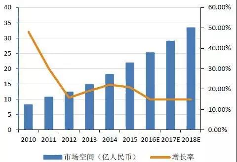 2010-2018年中國機器視覺市場空間及增速
